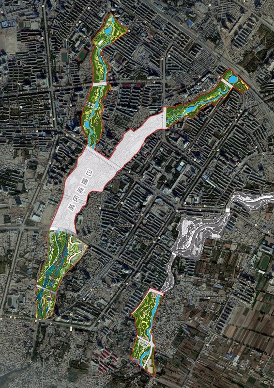 項(xiàng)目位于哈密市區(qū),分為東河和西河兩條水系,由北至南橫跨整個(gè)城市區(qū),本次研究范圍約1515745平方米(151公頃)。現(xiàn)狀已建成部分為全民健身公園、人民公園以及哈鐵公園,占地約為517789平方米(51.8公頃)。本次規(guī)劃設(shè)計(jì)范圍997956平方米(99.7公頃)。
