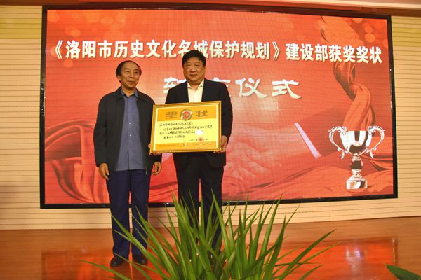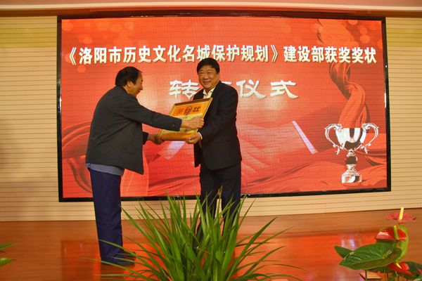 緊接著,在萬眾矚目中,公司總經(jīng)理曹紅普從特邀嘉賓、洛陽市城市規(guī)劃專家委員會主任李國恩的手中接過《洛陽市歷史文化名城保護(hù)規(guī)劃》住建部獲獎獎狀,并向李國恩局長敬獻(xiàn)鮮花,李局長回贈公司親筆書寫的墨寶“齊心協(xié)力”。全體參會人員共同見證了這激動人心的歷史性時刻,會議室一片沸騰,響起了隆重?zé)崃?、彌久不絕的掌聲。